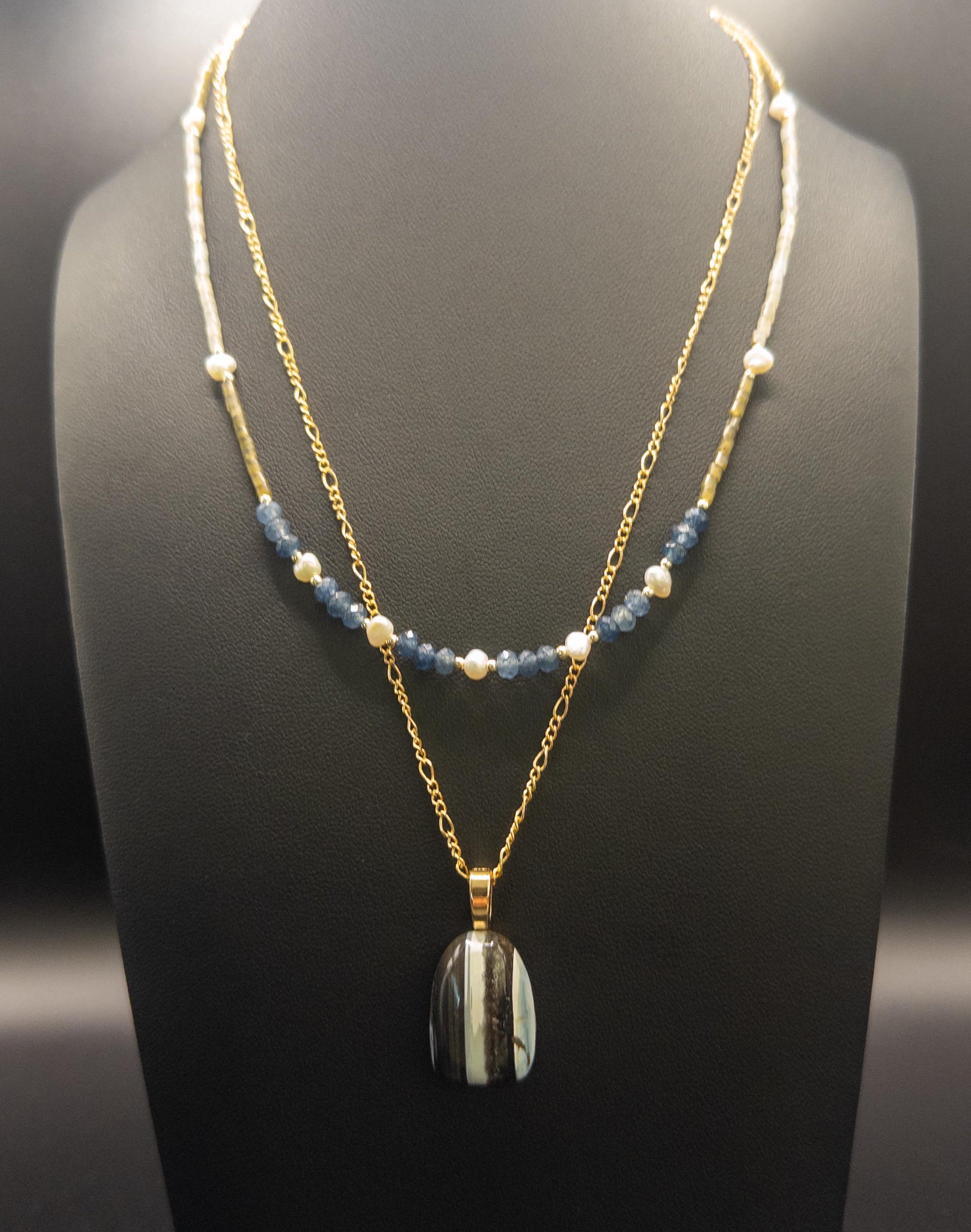 Shimmer into style with this breathtaking handmade necklace featuring a stunning blue opal pendant, complemented by freshwater pearls, amazonite, labradorite, and agate beads.