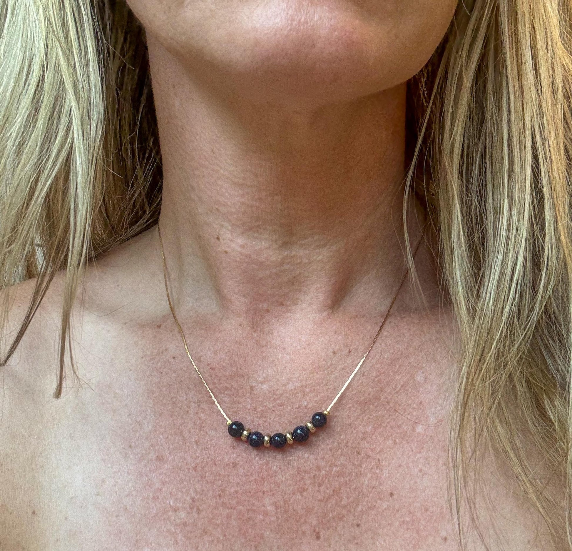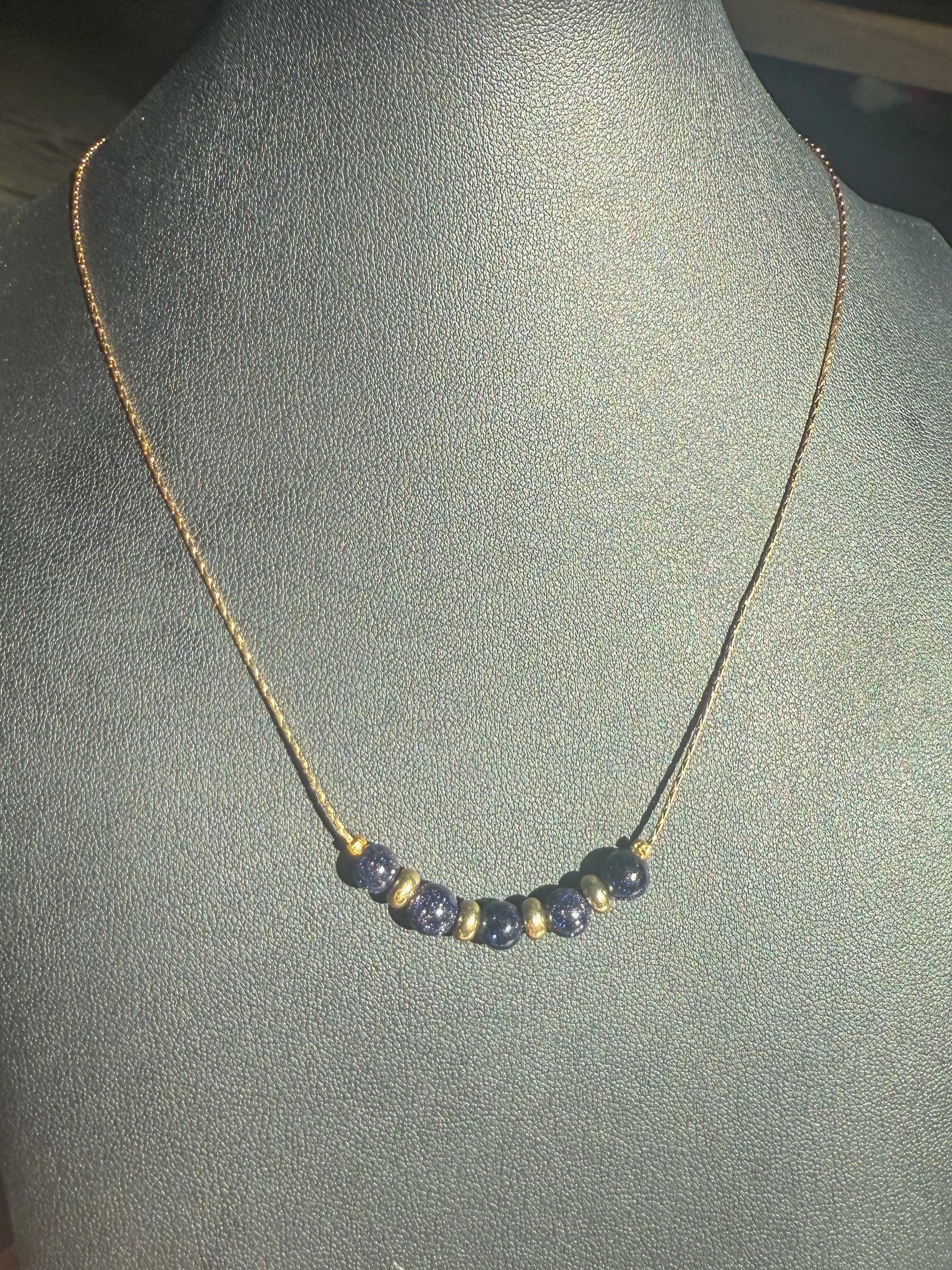 Elevate your everyday look with this stunning dainty blue goldstone necklace, a perfect blend of sparkle and sophistication. Handcrafted with genuine blue goldstone beads that shimmer like a starry night sky, this 16-inch choker-style piece features subtle 14K gold-plated accents for a touch of luxury. The sparkly beads are carefully strung on a delicate gold-plated chain, creating an elegant, minimalist design that’s ideal for layering or wearing solo.
