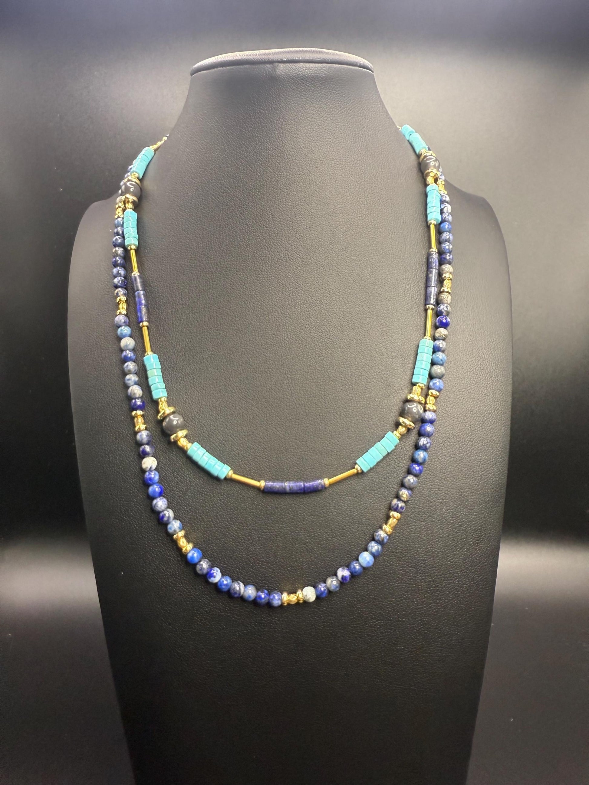 Discover the elegance of this handcrafted two-strand lapis lazuli and turquoise necklace, featuring genuine gemstones with gold-plated accents and a durable toggle clasp.