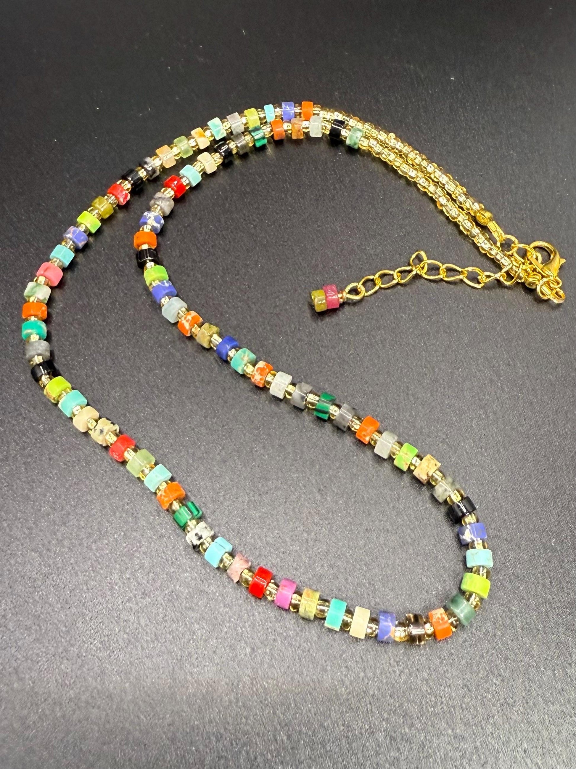 Elevate your ensemble with this sophisticated handmade necklace featuring multicolor natural stone heishi beads.