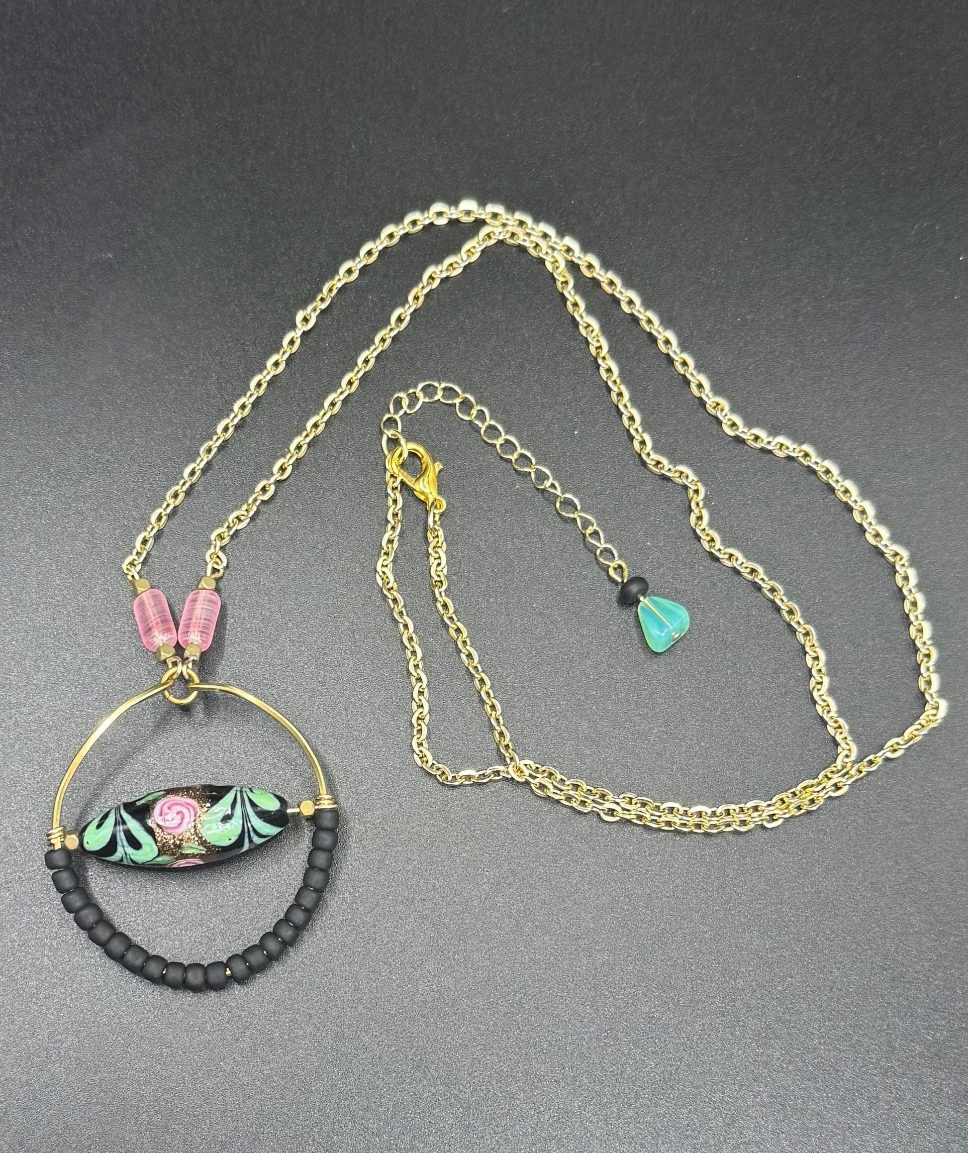 Elevate your style with this stunning handmade necklace featuring vintage WG beads, a glass bead centerpiece adorned with intricate floral designs and complemented by a 14k gold-plated chain.
