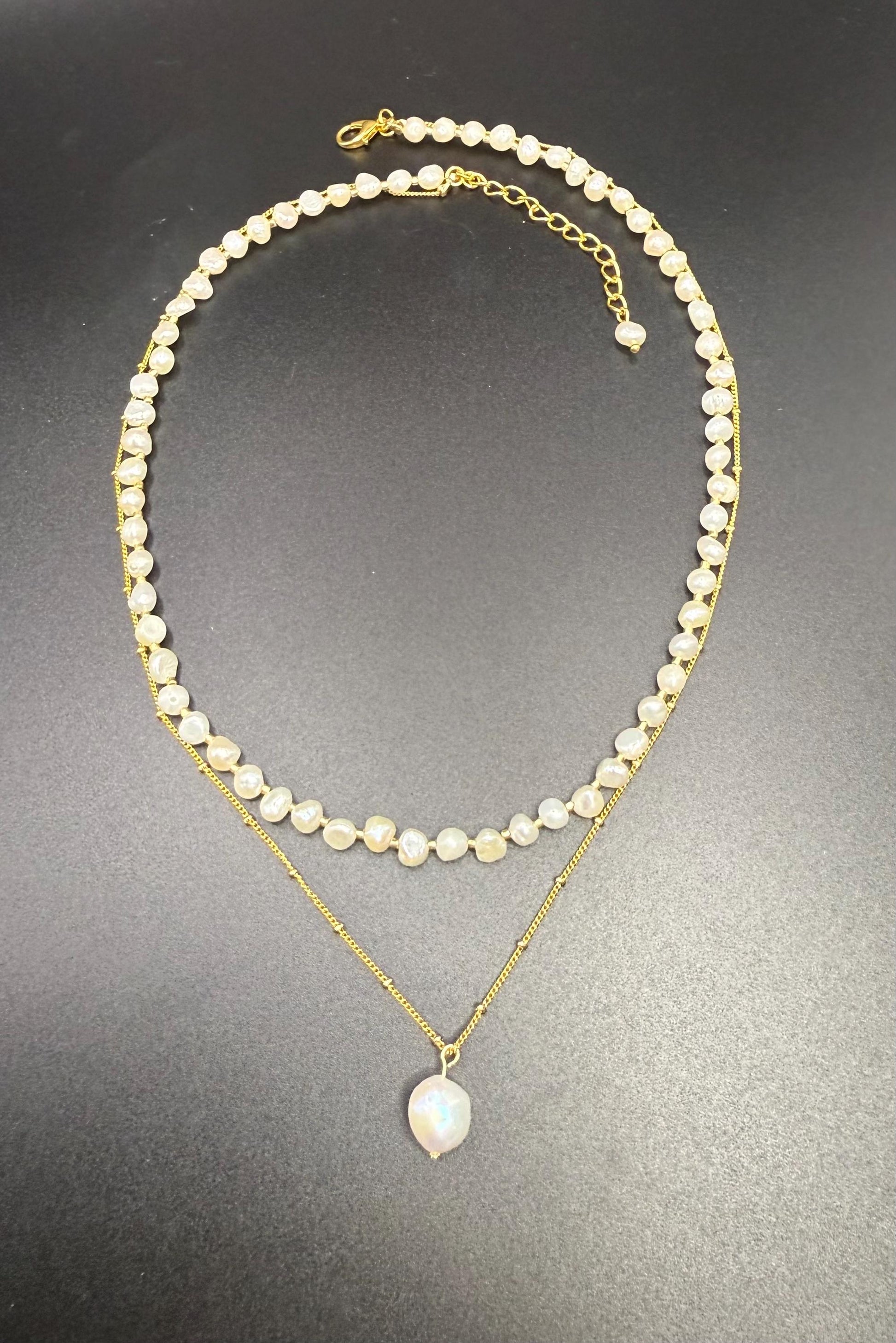 Add a touch of elegance to your collection with this exquisite two-strand freshwater pearl necklace. Featuring lustrous freshwater pearls and a stunning pearl pendant, this handmade piece is adorned with 14k gold-plated accents for a luxurious finish.